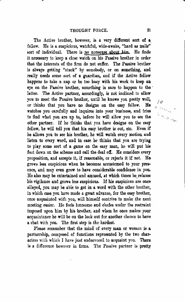 Please remember that the mind of every man or woman is a partnership, composed of functions represented by the two characters with which I have just endeavored to acquaint you. There is a difference however in firms. The Passive partner is pretty