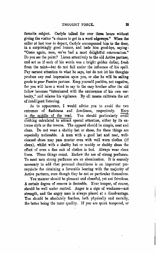 favorite subject. Carlyle talked for over three hours without giving the visitor "a chance to get a word in edgewise." When the caller at last rose to depart, Carlyle accompanied him to the door, in a surprisingly good humor, and bade him good-bye saying, "Come again, mon, we've had a most delightful conversation." Do you see the point? Listen attentively to the old Active partner, and act as if each of his words was a bright golden dollar, fresh from the mint - but do not fall under the influence of his spell. Pay earnest attention to what he says, but do not let his thoughts produce any real impression upon you, or else he will be selling goods to you, Passive partner. Keep yourself positive, not negative, for you will have a word to say to the easy brother after the old fellow becomes "intoxicated with the exuberance of his own verbosity," and relaxes his vigilance. By all means cultivate the art of intelligent listening.