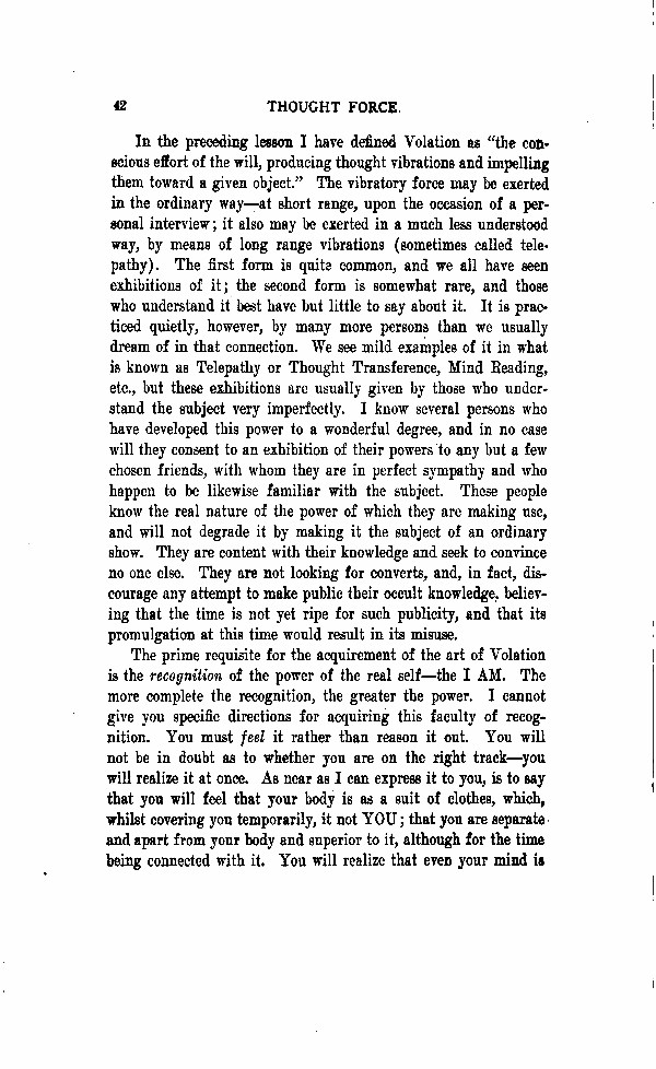 The prime requisite for the acquirement of the art of Volation is the recognition of the power of the real self - the I AM. The more complete the recognition, the greater the power. I cannot give you specific directions for acquiring this faculty of recognition. You must feel it rather that reason it out. You will not be in doubt as to whether you are on the right track - you will realize it at once. As near as I can express it to you, is to say that you will feel that your body is as a suit of clothes, which, whilst covering you temporarily, its not YOU; that you are separate and apart from your body and superior to it, although for the time being connected with it. You will realize that even your mind is