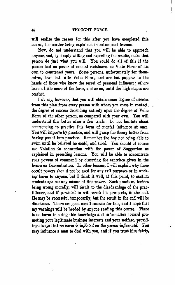 I do say, however, that you will obtain some degree of success from this plan from every person with whom you come in contact, the degree of success depending entirely upon the degree of Volic Force of the other person, as compared with you own. You will understand this well after a few trials. Do not hesitate in commencing to practice this form of mental influence at once. You will improve by practice, and will grasp the theory better from having put it into practice. Remember the boy not being able to swim until he believed he could, and tried. You should of course use Volation in connection with the power of suggestion as explained in preceding lessons. You will be able to concentrate your powers of command by observing the exercises given in the lesson on Concentration. In other lessons, I will explain why these occult powers should not be used for any evil purposes or in working harm to anyone, but I think it well, at this point to caution students against any misuse of this power. Such practices, besides being wrong morally, will result to the disadvantage of the practitioner, and if persisted in, will wreck his prospects in the end. He may be successful temporarily but the result in the end will be disastrous. There are good occult reasons for this, and I hope that my warnings will be heeded by anyone reading this course. There is no harm in using this knowledge and information toward promoting your legitimate business interests and your welfare, providing always that no harm is inflicted on the person influenced. You may influence a man to deal with you, and if you treat him fairly,