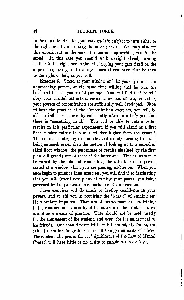 These exercises will do much to develop confidence in you powers, and to aid you in acquiring the "knack" of sending out the vibratory impulses. They are of course more or less trifling in their natures, and unworthy of the exercise of the mental powers, except as a means of practice. They should not be used merely for the amusement of the student, and never for the amusement of his friends. One should never trifle with these mighty forces, nor exhibit them for the gratification of the vulgar curiosity of others. The student who grasps the real significance of the Law of Mental control will have little or no desire to parade his knowledge.
