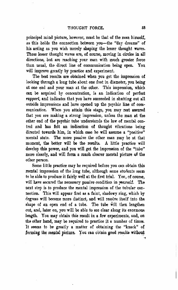 The best results are obtained when you get the impression of looking through a long tube about one foot in diameter, you being at one end and your man at the other. This impression, which can be acquired by concentration, is an indication of perfect rapport, and indicates that you have succeeded in shutting out all outside impressions and have opened up the psychic line of communication. When you attain this stage, you may rest assured that you are making a strong impression, unless the man at the other end of the psychic tube understands the law of mental control and had felt an indication of thought vibrations being directed toward him, in which case he will assume a "positive" mental state. The more passive the other man may be at that moment; the better will be the results. A little practice will develop this power, and you will get the impression of the "tube" more clearly, and will form a much clearer mental picture of the other person.