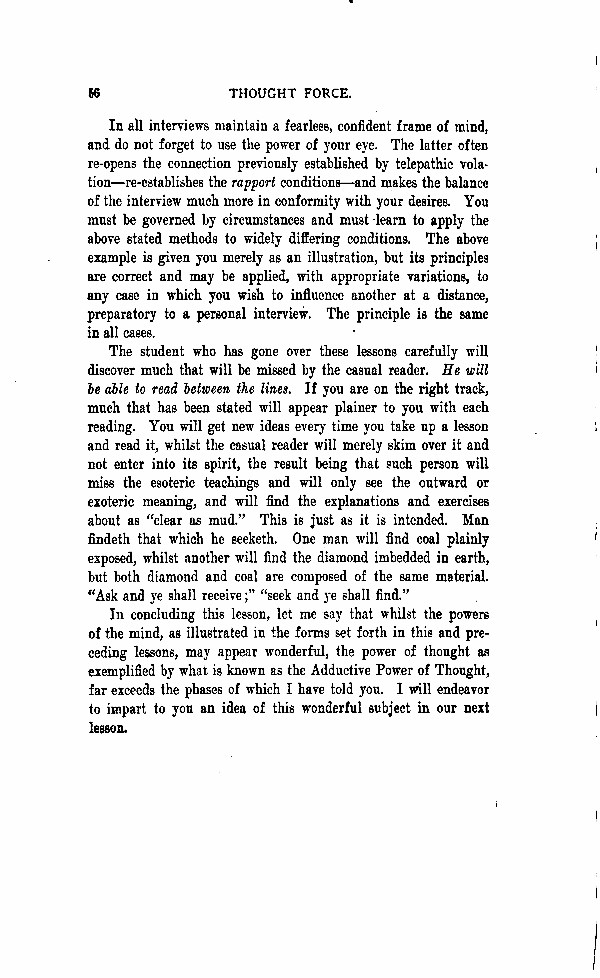 In all interviews maintain a fearless, confident frame of mind, and do not forget to use the power of your eye. The latter often reopens the connection previously established by telepathic volation - reestablishes the rapport conditions - and makes the balance of the interview much more in conformity with your desires. You must be governed by circumstances and must learn to apply the above stated methods to widely differing conditions. The above sample is given you merely as an illustration. Its principles are correct and maybe apply, with appropriate variations, to any case in which you wish to influence another at a distance, preparatory to a personal interview. The principle is the same in all cases.