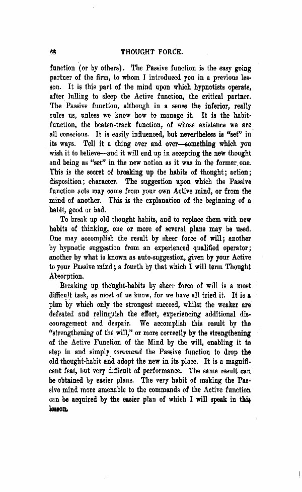 To break up old thought habits, and to replace them with new habits of thinking, one or more of several plans may be used. One may accomplish the results by sheer force of will; another by hypnotic suggestion from an experienced qualified operator; to your Passive mind, a fourth by that which I will term Thought Absorption.