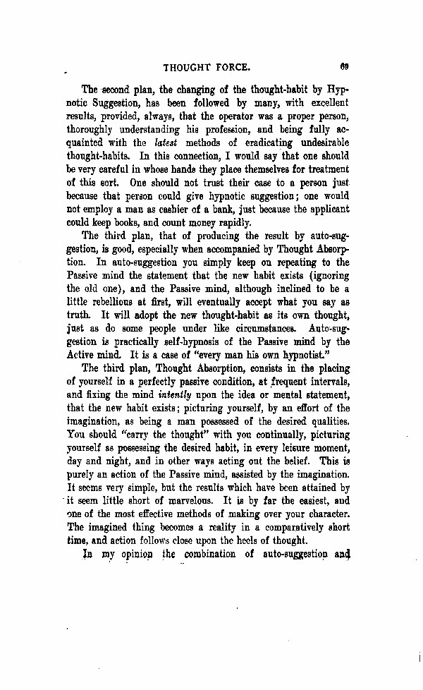 The second plan, the changing of the thought-habit by Hypnotic Suggestion, has been followed by many, with excellent results, provided, always, that the operator was a proper person, thoroughly understanding his profession, and being fully acquainted with the latest methods of eradicating undesirable thought-habits. In this connection, I would say that one should be very careful in whose hands they place themselves for treatment of this sort. One should not trust their case to a person just because that person could give hypnotic suggestion; one would not employ a man as cashier of a bank just because the applicant could keep books, and count money rapidly.