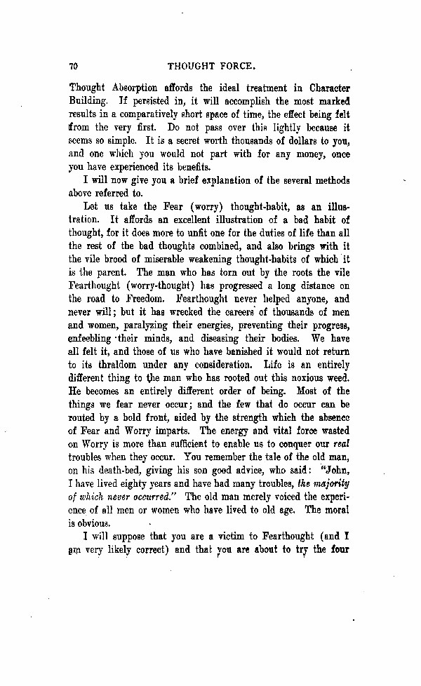Let us take the Fear (worry) thought-habit, as an illustration. It affords an excellent illustration of the bad habits of the rest of the bad thought, for it does more to unfit one for the duties of life than all the rest of the bad thoughts combined, and also brings with it the vile brood of miserable weakening thought-habits of which it is the parent. The man who has torn out by the roots the vile Fear thought (worry thought) has progressed a long distance on the road to Freedom. Fear thought never helped anyone, and never will; but it has wrecked the careers of thousands of men and women, paralyzing their energies, preventing their progress, enfeebling their minds, and diseasing their bodies. We have all felt it, and those of us who have banished it would not return to its thralldom under any consideration. Life is an entirely different thing to the man who has rooted out this noxious weed. He becomes an entirely different order of being. Most of the things we fear never occur; and the few that do occur can be rooted by a bold front, aided by the strength, which the absence of Fear and Worry imparts. The energy and vital force wasted on Worry is more that sufficient to enable us to conquer our real troubles when they occur. You remember the tale of the old man on his deathbed, giving his son good advice, who said: "John, I have lived eighty years and have had many troubles, the majority of which never occurred." The old man merely voiced the experience of all men or women who have lived to old age. The moral is obvious.