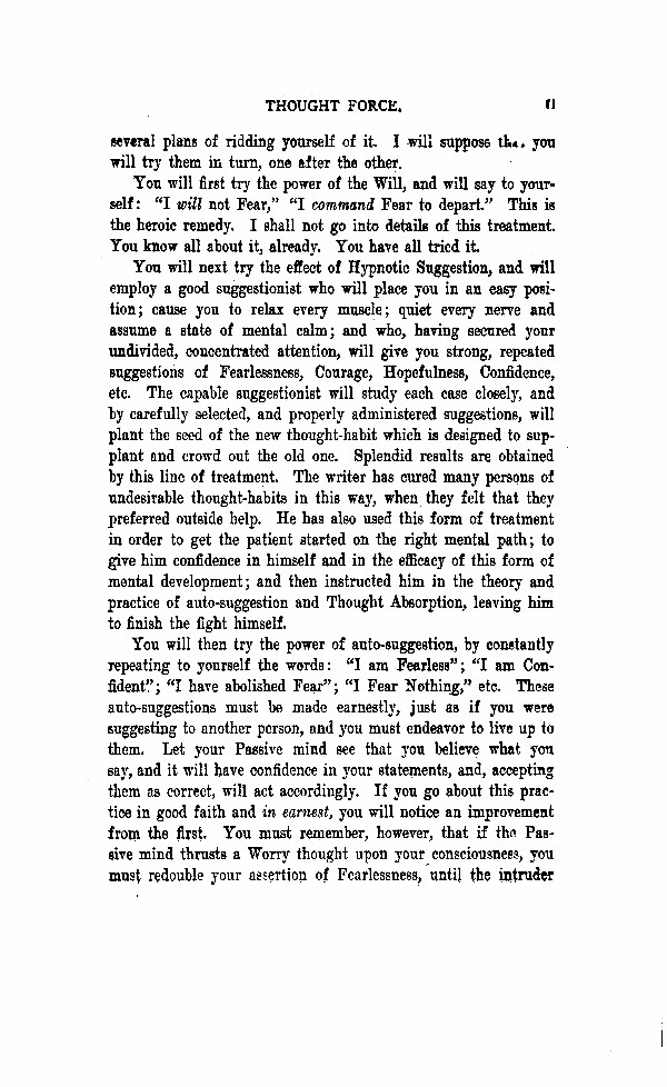 plans of ridding yourself of it. I will suppose that you will try them in turn one after the other. You will first try the power of the Will, and will say to yourself: "I will not Fear," "I command Fear to depart." This is the heroic remedy. I shall not go into details of this treatment. You know all about it, already. You have all tried it. You will next try the effect of Hypnotic Suggestion, and will employ a good suggestionist who will place you in an easy position; cause you to relax every muscle; quiet every nerve and assume a state of mental calm; and who, having secured your undivided, concentrated attention, will give you strong, repeated suggestions of Fearlessness, Courage, Hopefulness, Confidence, etc. The capable suggestionist will study each case closely, and by carefully selected, and properly administered suggestions, will plant the seed of the new thought-habit with its designed to supplant and crowd out the old one. Splendid results are obtained by this line of treatment. The writer has cured many persons of undesirable thought-habits in this way, when they felt that they preferred outside help. He has also used this form of treatment in order to get the patient started on the right mental path; to give him confidence in himself and in the efficacy of this form of mental development; and then instructed him in the theory and practice of auto-suggestion and Thought Absorption, leaving him to finish the fight himself.