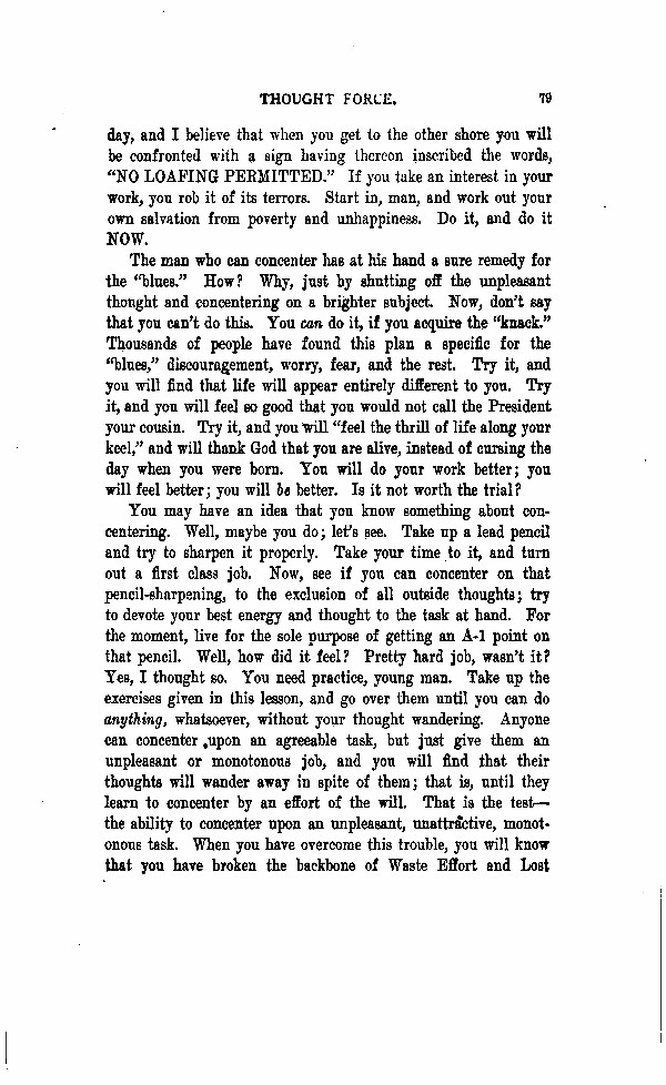 The man who can concenter has at his hand a sure remedy for the "blues." How? Why, just by shutting off the unpleasant thought and concentering on a brighter subject. Now, don't say that you can't do this. You can do it, if you acquire the "knack." Thousands of people have found this plan a specific for the "blues," discouragement, worry, fear, and the rest. Try it, and you will find that life will appear entirely different to you. Try it, and you will feel so good that you would not call the President your cousin. Try it, and you will "feel the thrill of life along your keel," and will thank God that you are alive, instead of curing the day when you were born. You will do your work better; you will feel better; you will be better. Is it not worth the trial?