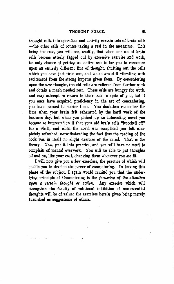 thought calls into operation and activates certain sets of brain cells - the other cells of course taking a rest in the meantime. This being the case, you will see, readily, that when one set of brain cells become utterly fagged out by excessive exercises and work, its only chance of getting an entire rest is for you to concenter upon an entirely different line of thought, shutting out the cells which you have just tired out, and which are still vibrating with excitement from the strong impetus given them. By concentering upon the new thought, the old cells are relieved from further work and obtain a much-needed rest. These cells are hungry for work, and may attempt to return to their task in spite of you, but if you have acquired proficiency in the art of concentering, you have learned to master them. You doubtless remember the time when your brain felt exhausted by the hard work of the business day, but when you pickup up an interesting novel you became so interested in it that your old brain cells "knocked off" for a while, and when the novel was completed you felt completely refreshed, not withstanding the fact that the reading of the book was in itself no slight exercises of the mind. That is the theory. Now, put it into practice, and you will have no need to complain of mental overwork. You will be able to put thoughts off and on, like your coat, changing them whenever you see fit.