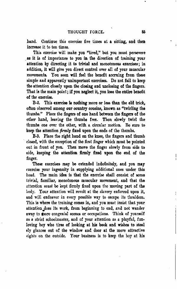 These exercises may be extended indefinitely, and you may exercise your ingenuity in supplying additional one under this head. The main idea is that the exercise shall consist of some trivial, familiar, momentous muscular movement, and that the attention must be kept firmly fixed upon the moving part of the body. Your attention will revolt at the slavery enforced upon it, and will endeavor in every possible way to escape its thralldom. This is where the training comes in, and you must insist that your attention does its work, from beginning to end, and not wander away to more congenial scenes or occupations. Think of yourself as a strict schoolmaster, and of your attention as a playful, fun loving boy who tires of looking at his book and wishes to steal sly glances out of the window and door at the more attractive sights on the outside. Your business is to keep the boy at his
