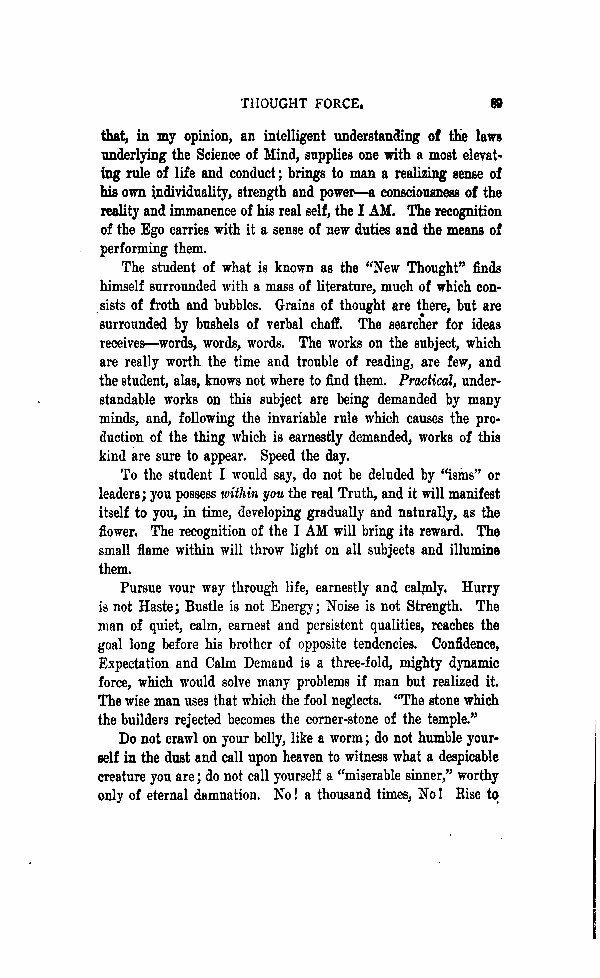 The student of what is known as the "New Thought" finds himself surrounded with a mass of literature, much of which consists of froth and bubbles. Grains of thought are there, but are surrounded by bushels of verbal chaff. The searcher for ideas receives - words, words, and words. The works on the subject, which are really worth the time and trouble of reading, are few, and the student, alas, knows not where to find them. Practical, understandable works on this subject are being demanded by many minds and following the invariable rule, which causes the production of the thing which is earnestly demanded, works of this kind are sure to appear. Speed the day.