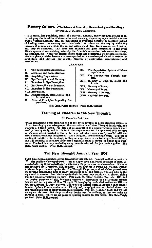 Preface - Dedication - Salutatory - The Nature of the Force - How the Thought Force Can Aid You - Direct Psychic Influence - A Little Worldly Wisdom - The Power of the Eye - The Magnetic Gaze - The Volic Force - Direct Volation - Telepathic Volation - The Adductive Quality of Thought - Character Building By Mental Control - The Art of Concentering - The Practice of Concentering - Valedictory - Contents