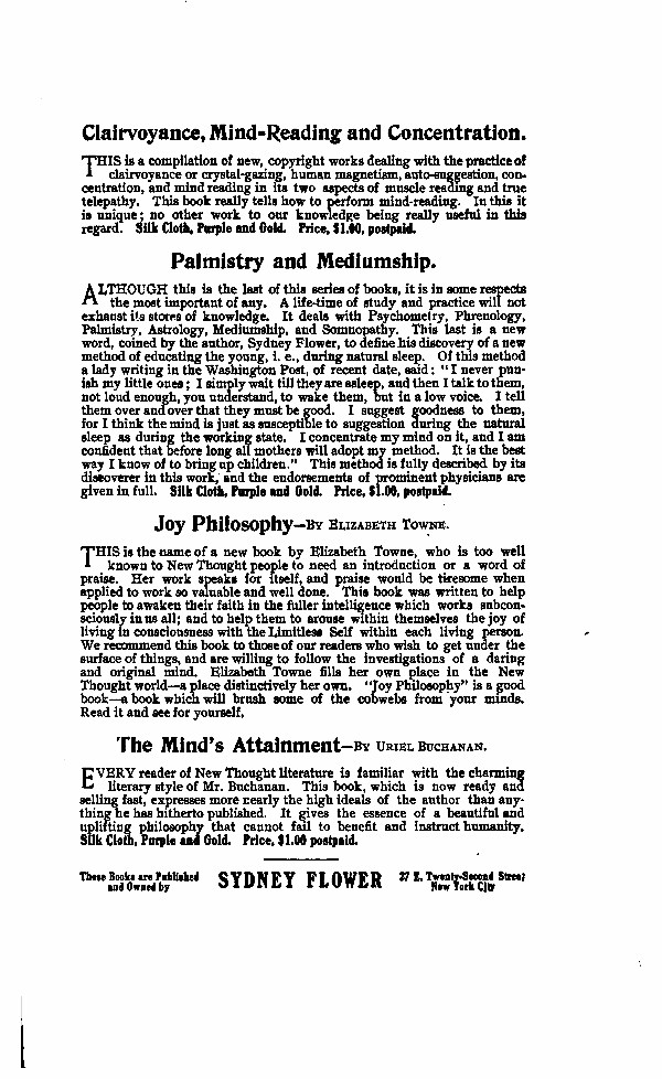 Preface - Dedication - Salutatory - The Nature of the Force - How the Thought Force Can Aid You - Direct Psychic Influence - A Little Worldly Wisdom - The Power of the Eye - The Magnetic Gaze - The Volic Force - Direct Volation - Telepathic Volation - The Adductive Quality of Thought - Character Building By Mental Control - The Art of Concentering - The Practice of Concentering - Valedictory - Contents