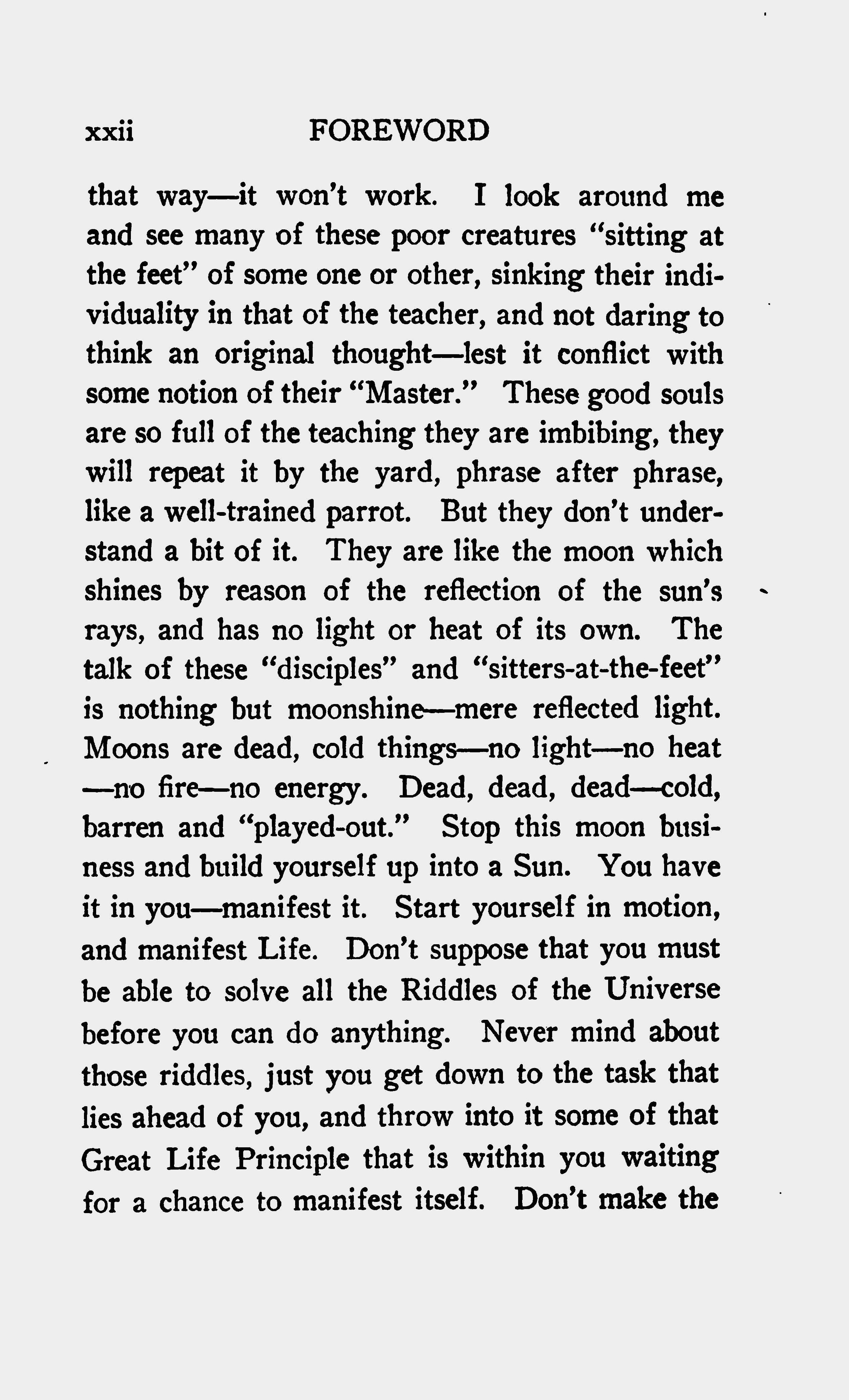 that way --- it won't work. I look around me and see many of these poor creatures "sitting at the feet" of someone or other, thinking their individuality in that of the teacher, and not daring to think an original thought --- lasted conflict with some notion of their "Master." These good souls are so full of the teaching their imbibing, they will repeated by the yard, phrase after phrase, like a well-trained period. But they don't understand the bit of it. They'll like the moon which shines by reason of the reflection of the sun's rays, and has no light or heat of its own. The talk of these "disciples" and "sitters-at-the-feet" is nothing but moonshine --- mere reflected light. Moves are dead, cold things --- no light --- no heat --- no fire --- no energy. Dead, dead, dead --- cold, barren and "played-out." Stop this moon business and build yourself up into a Sun. You have it in you --- manifest it. Start yourself in motion, and manifest Life. Don't suppose that you must be able to solve all the Riddles of the Universe before you can do anything. Never mind about those riddles, just you get down to the task that lies ahead of you, and throw into it some of that Great Life Principles that is within you waiting for a chance to manifest itself. Don't make the