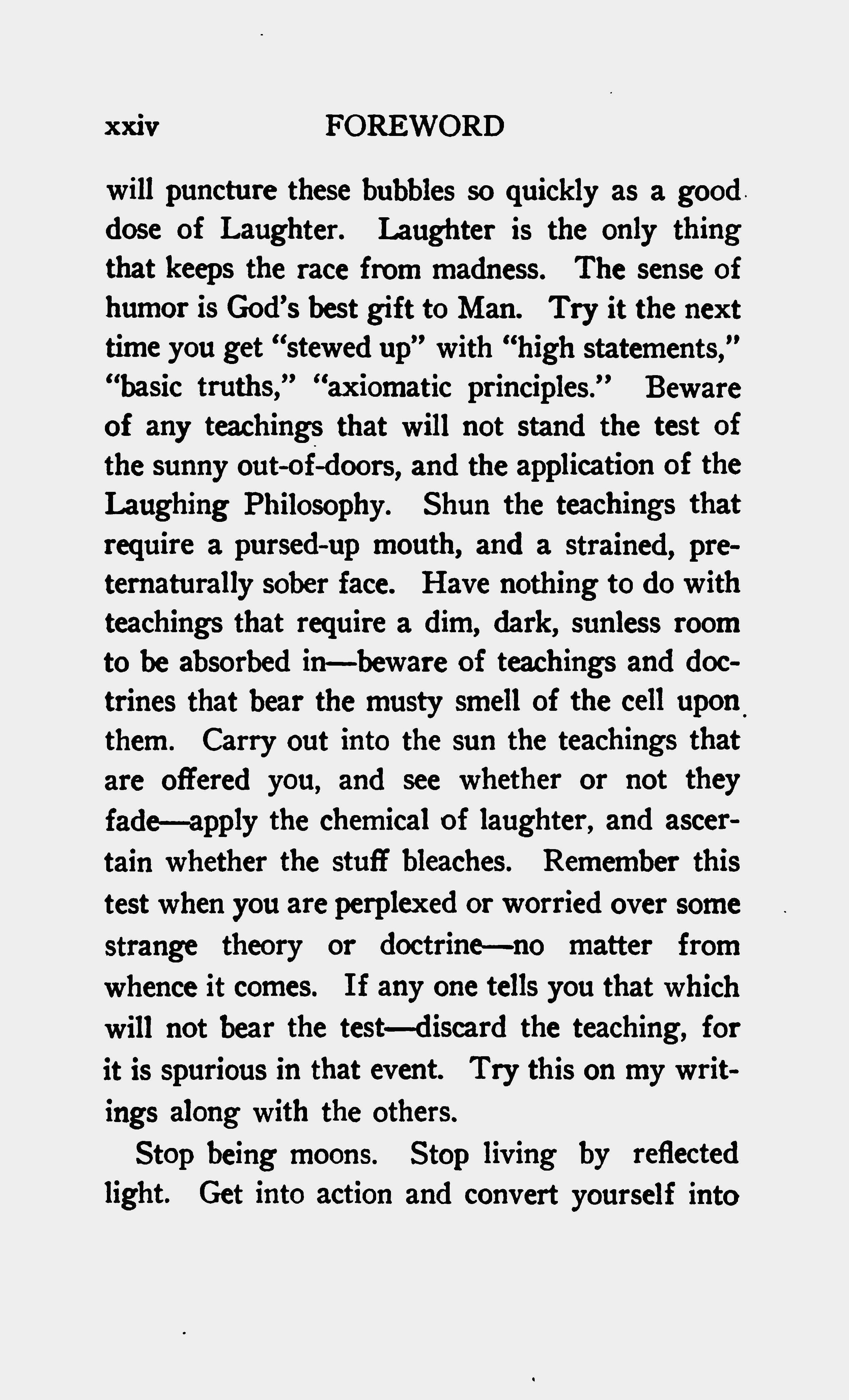 will puncture these bubbles so quickly as a good dose of Laughter. Laughter is the only thing that keeps the race for mad this. the sense of humor is God's best gift to Man. Try it the next time you get "stewed up" with "high statements," "basic truths," "axiomatic principles." Beware of any teachings that will not stand the test of the sunny out-of-doors, and the application of the Laughing Philosophy. Shun the teachings that require a pursed up mouth, and a strange, preternaturally sober face. Have nothing to do with teachings that require a dim, dark, sunless room to be absorbed in --- beware of teachings and doctrines as bare the musty smell of the cell upon them. Carry out in the sun the teachings that are offered to you, and see whether or not they fade --- apply the chemical of laughter, and ascertain whether the stuff bleaches. Remember this test when you are perplexed or worried over some strange theory or doctrine --- no matter from whence it comes. If anyone tells you that which will not bear the test --- disregard the teaching, for it is. In that event. Try this on my writing along with the others.