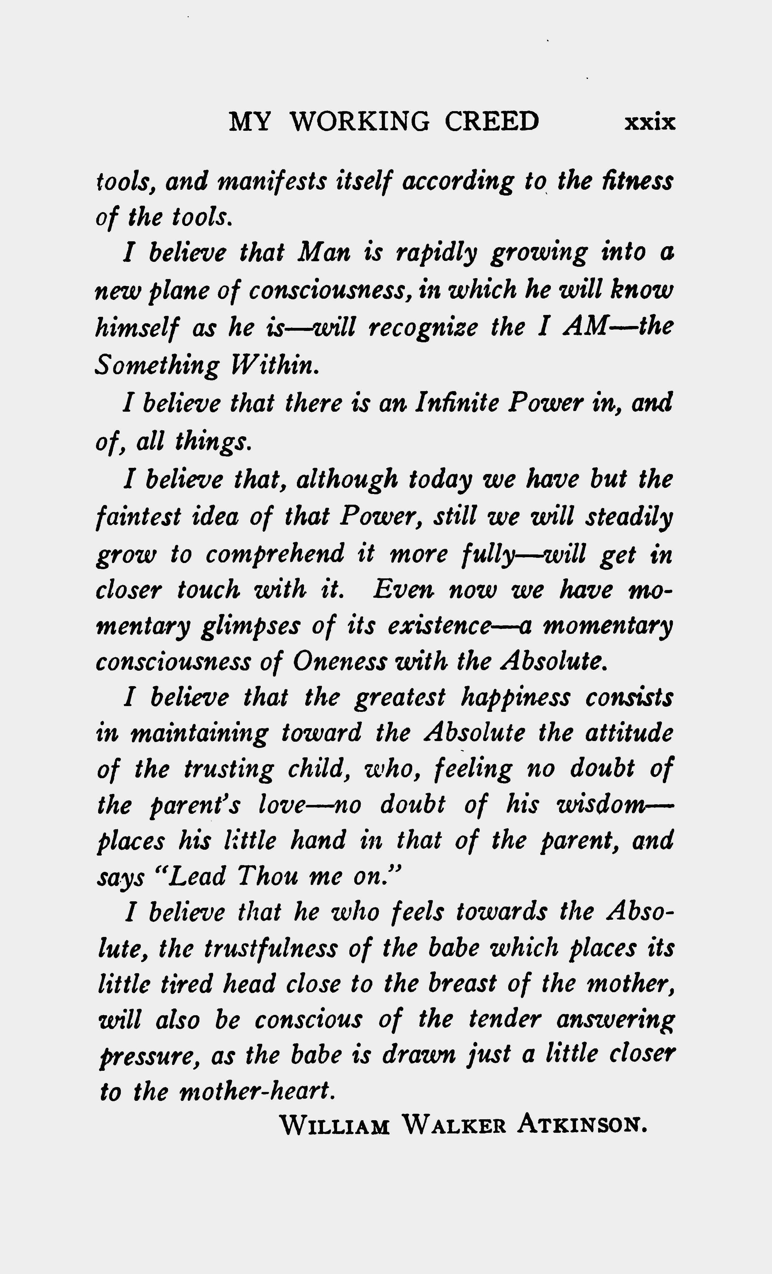 Preface - Foreword - My Working Creed - Law of Attraction in the Thought World - Thought Waves and Their Process of Reproduction - A Talk About The Mind - Mind Building - Secret of the Will - How to Become Immune to Injurious Thought Attraction - Transmutation of Negative Thought - Law of Mental Control - Asserting the Life-Force - Training the Habit-Mind - Psychology of Emotion - Developing New Brain Cells - Attractive Power - Desire Force - Great Dynamic Forces - Claiming Your Own - Law, Not Chance - Contents