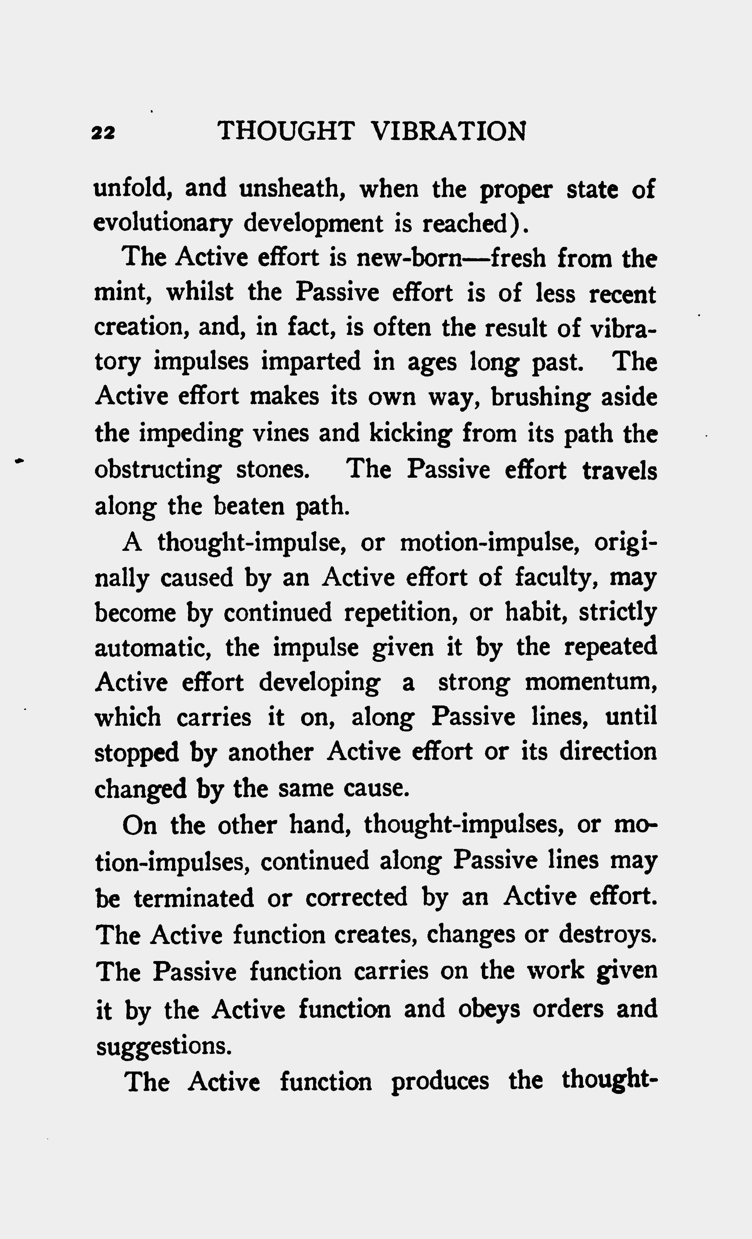 The Active effort is new-born - fresh from the mint, whilst the Passive effort is of less recent creation, and, in fact, is often the result of vibratory impulses imparted in ages long past. The Active effort makes its own way, brushing aside the impeding vines and kicking from its path the obstructing stones. The Passive effort travels along the beaten path.