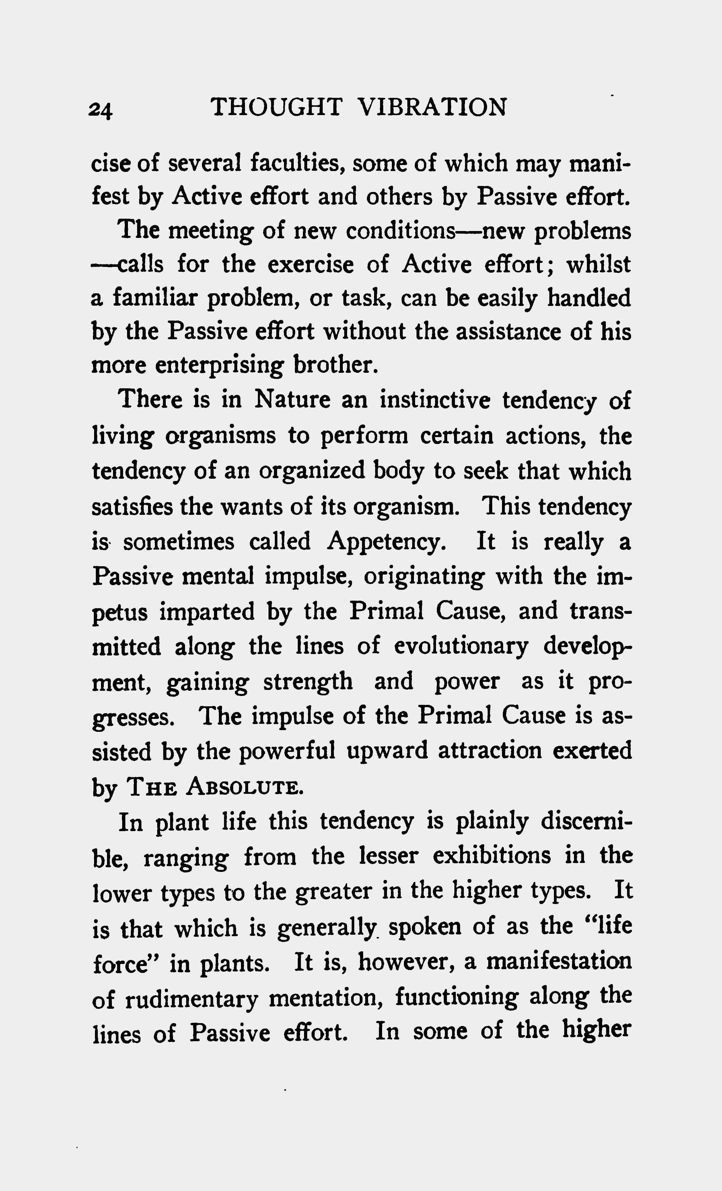 There is in Nature an instinctive tendency of living organisms to perform certain actions, the tendency of an organized body to seek that which satisfies the wants of its organism. This tendency is sometimes called Appetency. It is really a Passive mental impulse, originating with the impetus imparted by the Primal Cause, and transmitted along the lines of evolutionary development, gaining strength and power as it progresses. The impulse of the Primal Cause is assisted by the powerful upward attraction exerted by THE ABSOLUTE.