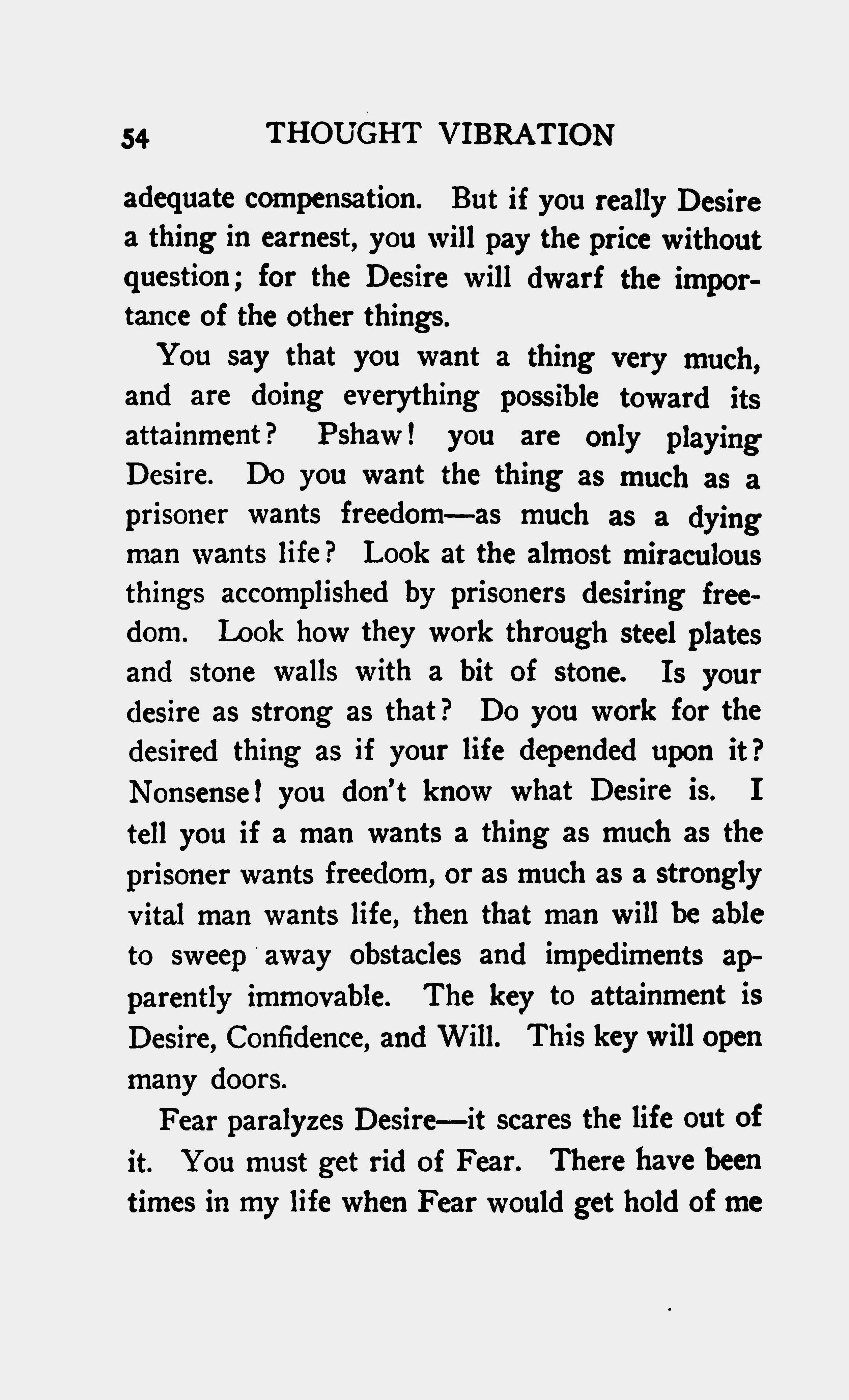 You say that you want a thing very much, and are doing everything possible toward its attainment? Pshaw! You are only playing Desire. Do you want the thing as much as a prisoner wants freedom - as much as a dying man wants life? Look at the almost miraculous things accomplished by prisoners desiring freedom. Look how they work through steel plates and stone walls with a bit of stone. Is your desire as strong as that? Do you work for the desired thing as if your life depended upon it? Nonsense! You don't know what Desire is. I tell you if a man wants a thing as much as the prisoner wants freedom, or as much as a strongly vital man wants life, then that man will be able to sweep away obstacles and impediments apparently immovable. The key to attainment is Desire, Confidence, and Will. This key will open many doors.
