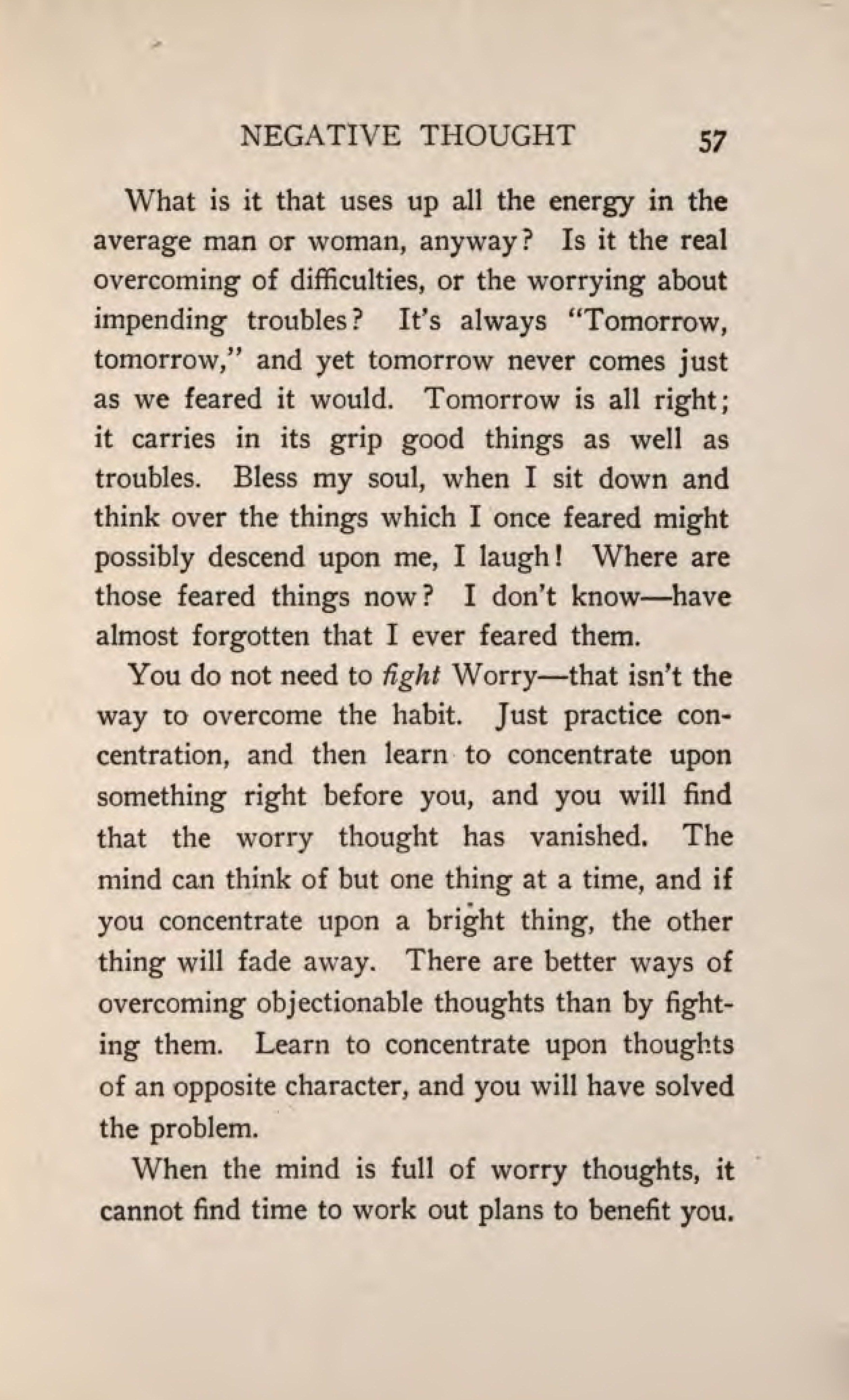 You do not need fight Worry - that isn't the way to overcome the habit. Just practice concentration, and then learn to concentrate upon something right before you, and you will find that the worry thought has vanished. The mind can think of but one thing at a time, and if you concentrate upon a bright thing, the other thing will fade away. There are better ways of overcoming objectionable thoughts than by fighting them. Learn to concentrate upon thoughts of an opposite character, and you will have solved the problem.