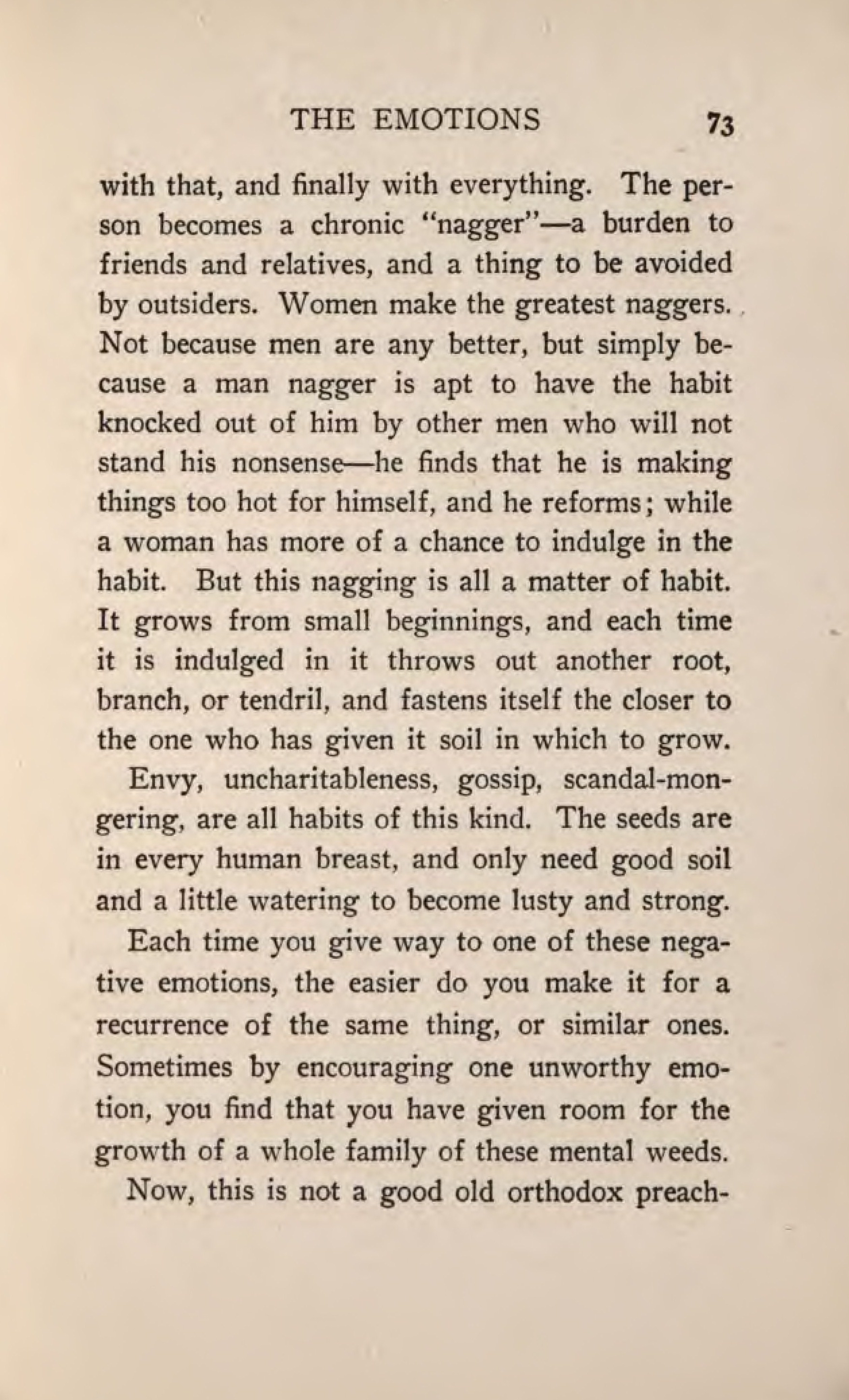 with that, and finally with everything. The person becomes a chronic "nagger" - a burden to friends and relatives, and a thing to be avoided by outsiders. Women make the greatest naggers. Not because men are any better, but simply because a man nagger apt to have the habit knocked out of him by other men who will not stand his nonsense - he find that he is making things too hot for himself and he reforms; while a woman has more of a chance to indulge in the habit. But this nagging is all a matter of habit. It grows from small beginnings, and each time it is indulged in it throws out another root, branch, or tendril, and fastens itself the closer to the one who has given it soil in which to grow.