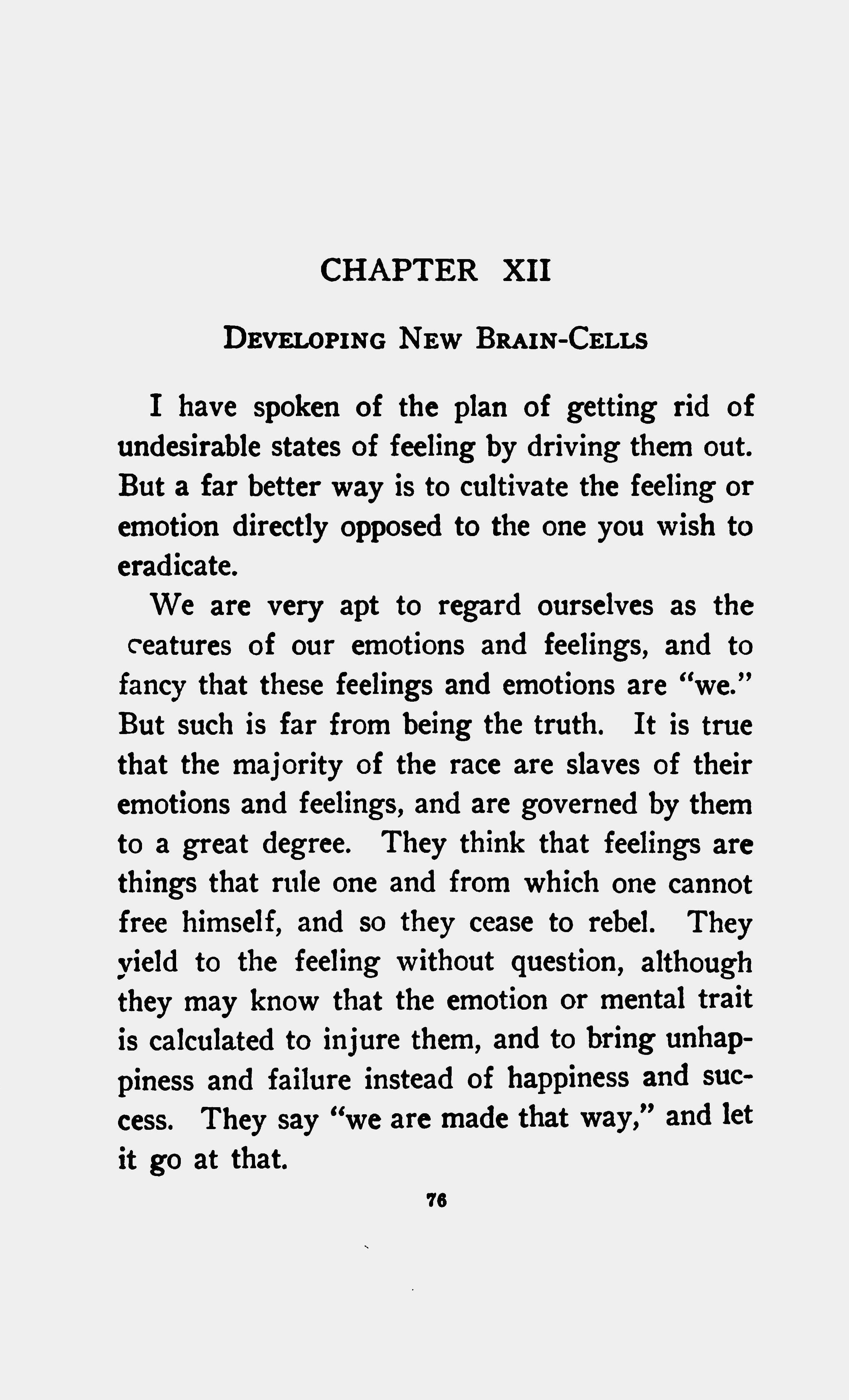 We are very apt to regard ourselves as the creatures of our emotions and feelings, and to fancy that these feelings and emotions are "we." But such is far from being the truth. It is true that the majority of the race are slaves of their emotions and feelings, and are governed by them to a great degree. They think that feelings are things that rule one and from which one cannot free himself, and so they cease to rebel. They yield to the feeling without question, although they may know that the emotion or mental trait is calculated to injure them, and to bring unhappiness and failure instead of happiness and success. They say, "We are made that way," and let it go at that.