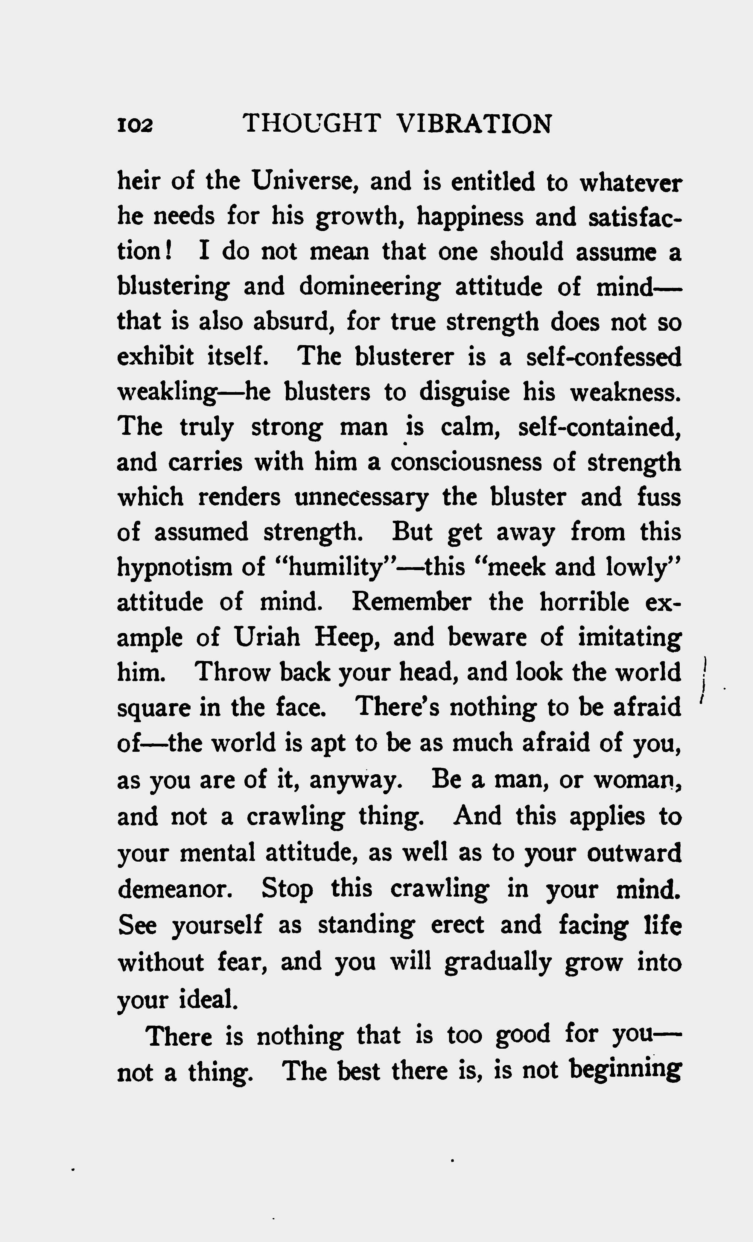 heir of the Universe, and is entitled to whatever he needs for his growth, happiness and satisfaction! I do not mean that one should assume a blustering and domineering attitude of mind - that is also absurd, for true strength does not so exhibit itself. The blusterer is a self-confessed weakling - he blusters to disguise his weakness. The truly strong man is calm, self-contained, and carries with him a consciousness of strength which renders unnecessary the bluster and fuss of assumed strength. But get away from this hypnotism of "humility" - this "meek and lowly" attitude of mind. Remember the horrible example of Uriah Heep, and beware of imitating him. Throw back you head, and look the world square in the face. There's nothing to be afraid of - the world is apt to be as much afraid of you, as yell are of it, anyway. Be a man, or woman, and not a crawling thing. And this applies to your mental attitude, as well as to your outward demeanor. Stop this crawling in your mind. See yourself as standing erect and facing life without fear, and you will gradually grow into your ideal.