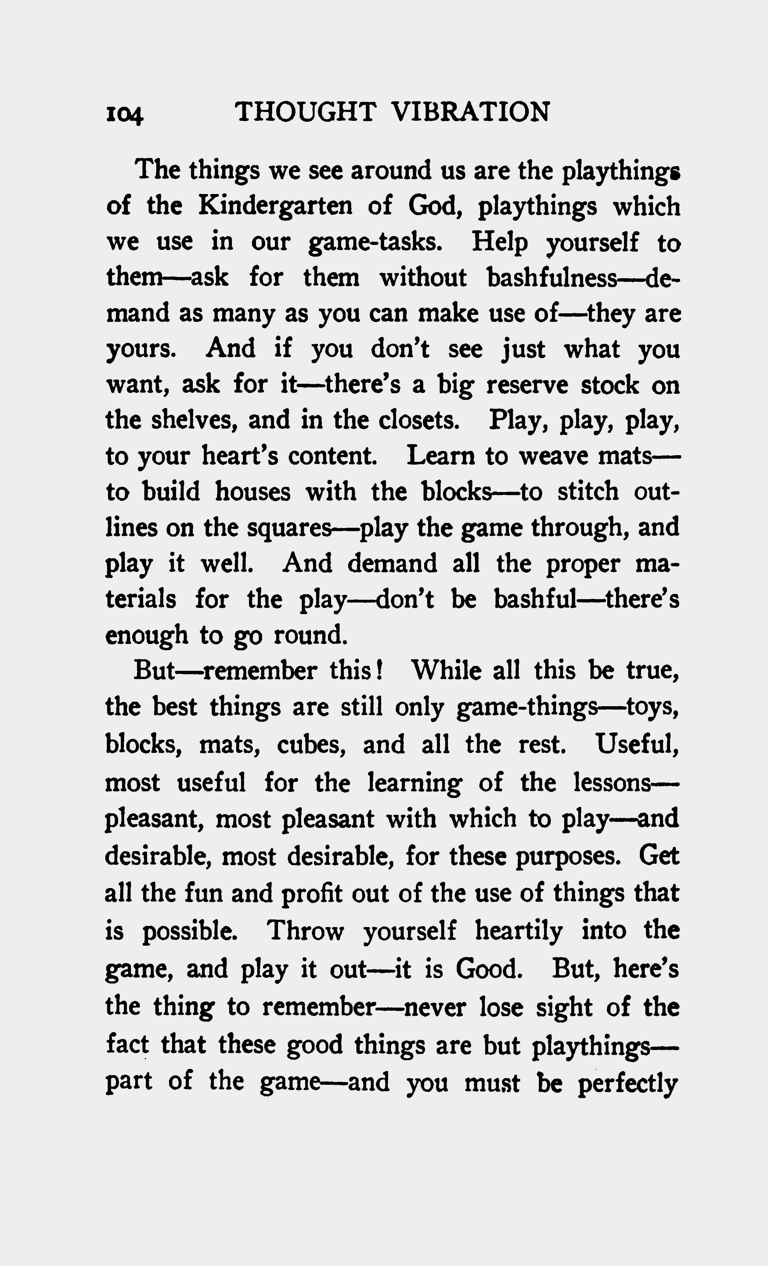 The things we see around us are the playthings of the Kindergarten of God, playthings which we use in our game-tasks. Help yourself to them - ask for them without bashfulness demand as many as you can make use of - they are yours. And if you don't see just what you want, ask for it - there's a big reserve stock on the shelves, and in the closets. Play, play, play, to your heart's content. Learn to weave mats - to build houses with the blocks - to stitch outlines on the squares - play the game through, and play it well. And demand all the proper materials for the play - don't be bashful - there's enough to go round.