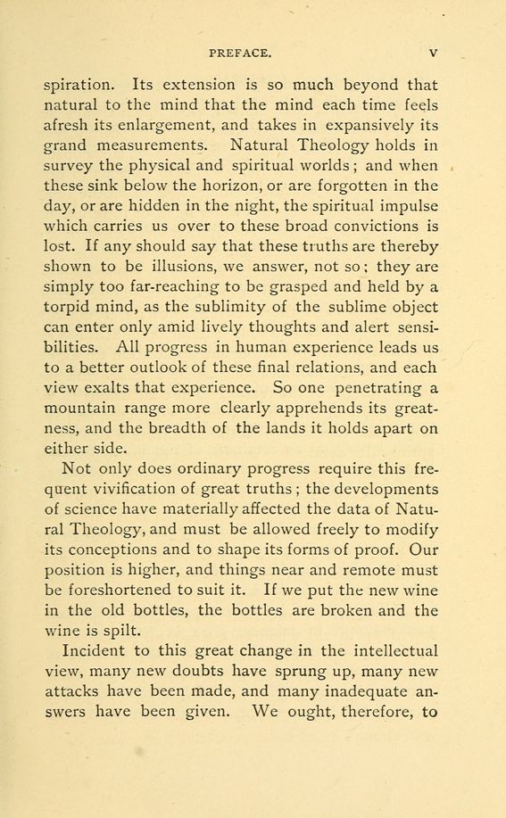 Not only does ordinary progress require this frequent vivification of great truths; the developments of science have materially affected the data of Natural Theology, and must be allowed freely to modify its conceptions and to shape its forms of proof. Our position is higher, and things near and remote must be foreshortened to suit it. If we put the new wine in the old bottles, the bottles are broken and the wine is spilt.