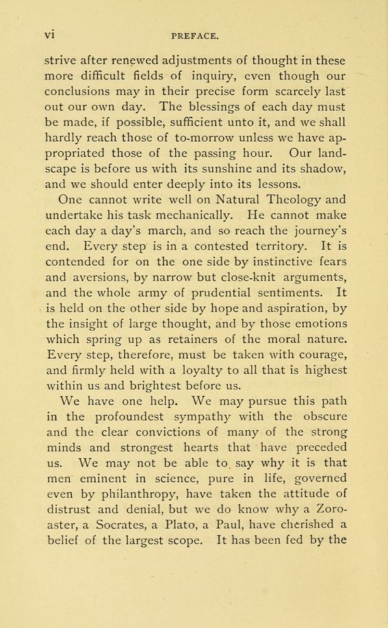 One cannot write well on Natural Theology and undertake his task mechanically. He cannot make each day a day's march, and so reach the journey's end. Every step is in a contested territory. It is contended for on the one side by instinctive fears and aversions, by narrow but close-knit arguments, and the whole army of prudential sentiments. It is held on the other side by hope and aspiration, by the insight of large thought, and by those emotions which spring up as retainers of the moral nature. Every step, therefore, must be taken with courage, and firmly held with a loyalty to all that is highest within us and brightest before us.