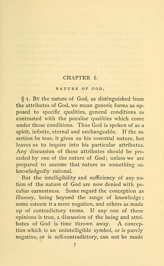 But the intelligibility and sufficiency of any notion of the nature of God are now denied with peculiar earnestness. Some regard the conception as illusory, being beyond the range of knowledge; some esteem it a mere negation, and others as made up of contradictory terms. If any one of these opinions is true, a discussion of the being and attributes of God is time thrown away. A conception which is an unintelligible symbol, or is purely negative, or is self-contradictory, can not be made