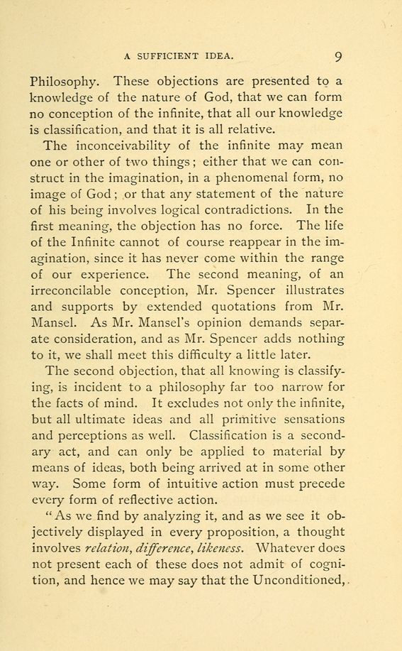 Philosophy. These objections are presented to a knowledge of the nature of God, that we can form no conception of the infinite, that all our knowledge is classification, and that it is all relative.