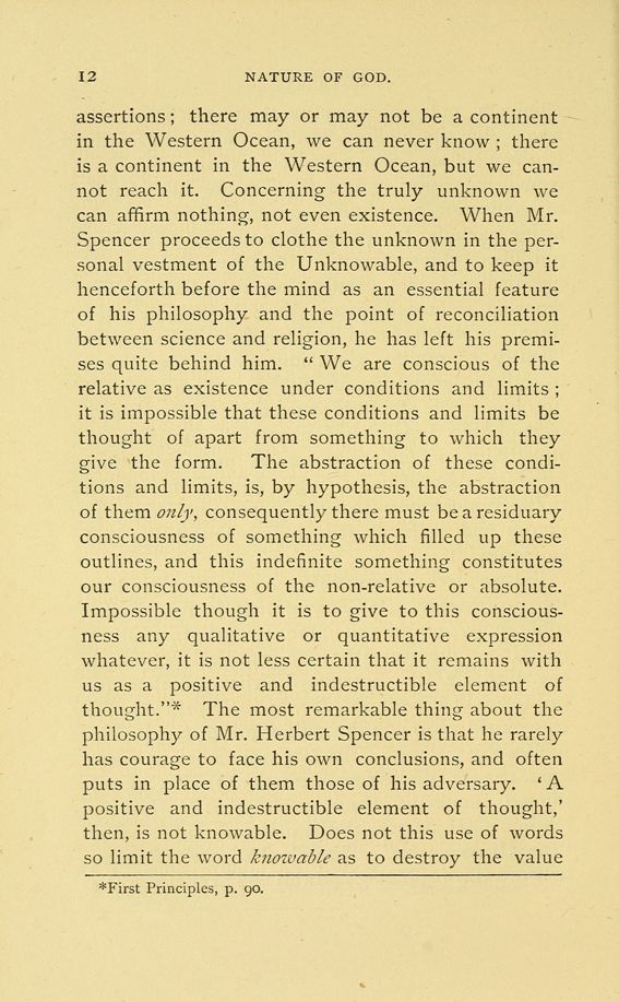 assertions; there may or may not be a continent in the Western Ocean, we can never know; there is a continent in the Western Ocean, but we cannot reach it. Concerning the truly unknown we can affirm nothing, not even existence. When Mr. Spencer proceeds to clothe the unknown in the personal vestment of the Unknowable, and to keep it henceforth before the mind as an essential feature of his philosophy and the point of reconciliation between science and religion, he has left his premises quite behind him. "We are conscious of the relative as existence under conditions and limits; it is impossible that these conditions and limits be thought of apart from something to which they give the form. The abstraction of these conditions and limits, is, by hypothesis, the abstraction of them only, consequently there must be a residuary consciousness of something which filled up these outlines, and this indefinite something constitutes our consciousness of the non-relative or absolute. Impossible though it is to give to this consciousness any qualitative or quantitative expression whatever, it is not less certain that it remains with us as a positive and indestructible element of thought."* The most remarkable thing about the philosophy of Mr. Herbert Spencer is that he rarely has courage to face his own conclusions, and often puts in place of them those of his adversary. A positive and indestructible element of thought,' then, is not knowable. Does not this use of words so limit the word knowable as to destroy the value