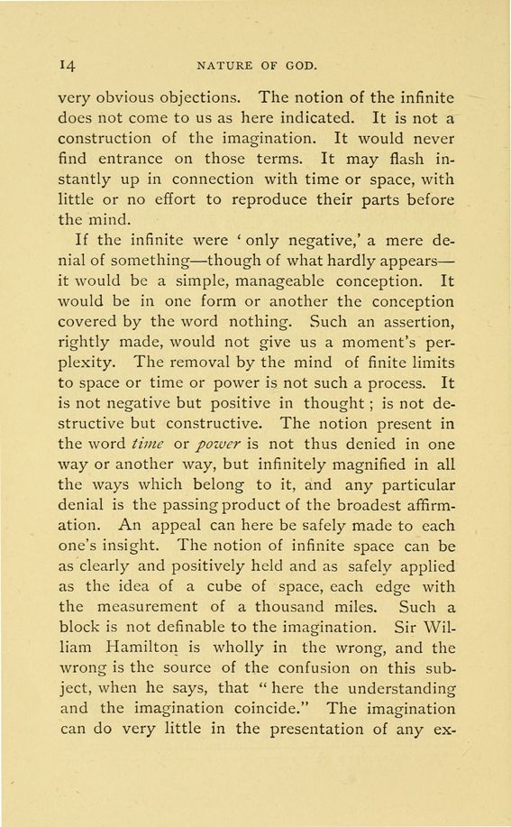 If the infinite were 'only negative,' a mere denial of something --- though of what hardly appears --- it would be a simple, manageable conception. It would be in one form or another the conception covered by the word nothing. Such an assertion, rightly made, would not give us a moment's perplexity. The removal by the mind of finite limits to space or time or power is not such a process. It is not negative but positive in thought; is not destructive but constructive. The notion present in the word time or power is not thus denied in one way or another way, but infinitely magnified in all the ways which belong to it, and any particular denial is the passing product of the broadest affirmation. An appeal can here be safely made to each one's insight. The notion of infinite space can be as clearly and positively held and as safely applied as the idea of a cube of space, each edge with the measurement of a thousand miles. Such a block is not definable to the imagination. Sir William Hamilton is wholly in the wrong, and the wrong is the source of the confusion on this subject, when he says, that "here the understanding and the imagination coincide." The imagination can do very little in the presentation of any extended