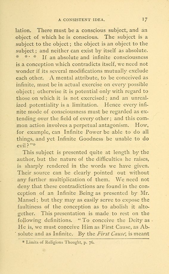 * * * If an absolute and infinite consciousness is a conception which contradicts itself, we need not wonder if its several modifications mutually exclude each other. A mental attribute, to be conceived as infinite, must be in actual exercise on every possible object; otherwise it is potential only with regard to those on which it is not exercised; and an unrealized potentiality is a limitation. Hence every infinite mode of consciousness must be regarded as extending over the field of every other; and this common action involves a perpetual antagonism. How, for example, can Infinite Power be able to do all things, and yet Infinite Goodness be unable to do evil?"*