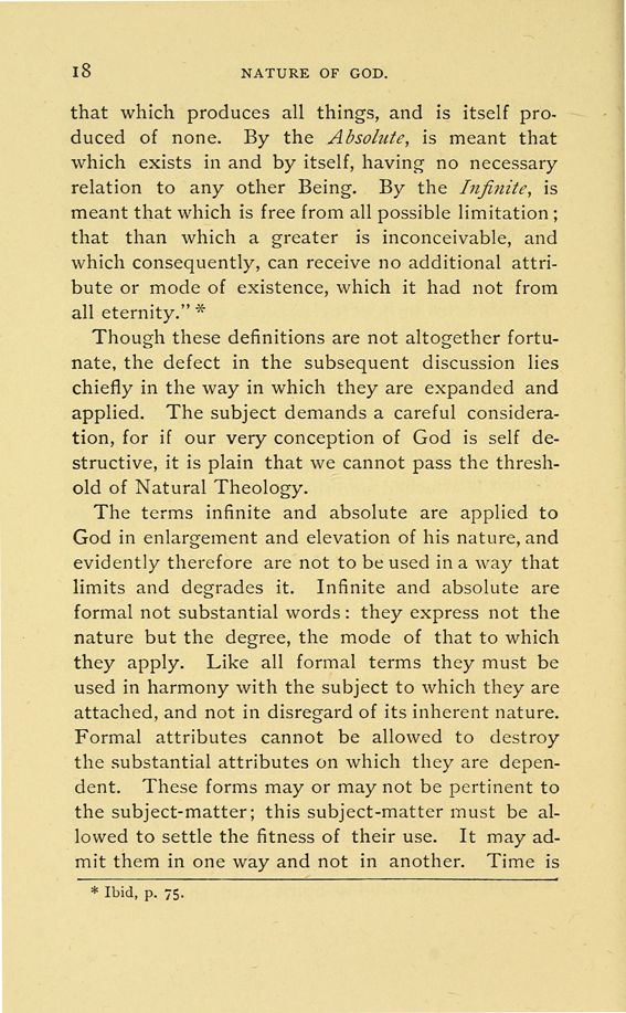 that which produces all things, and is itself produced of none. By the Absolute, is meant that which exists in and by itself, having no necessary relation to any other Being. By the Infinite, is meant that which is free from all possible limitation; that than which a greater is inconceivable, and which consequently, can receive no additional attribute or mode of existence, which it had not from all eternity." *
