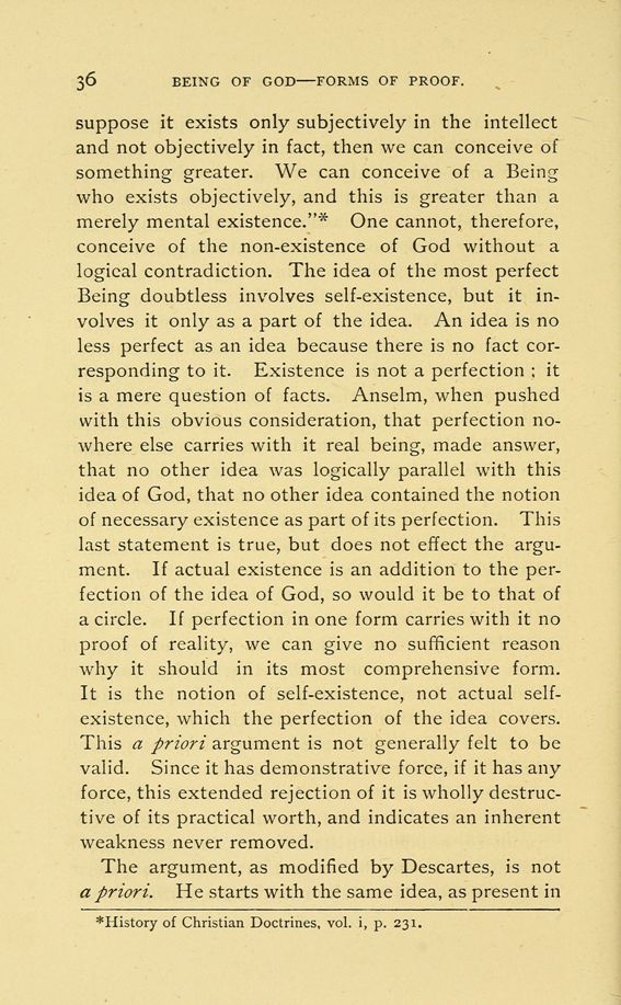 suppose it exists only subjectively in the intellect and not objectively in fact, then we can conceive of something greater. We can conceive of a Being who exists objectively, and this is greater than a merely mental existence."* One cannot, therefore, conceive of the non-existence of God without a logical contradiction. The idea of the most perfect Being doubtless involves self-existence, but it involves it only as a part of the idea. An idea is no less perfect as an idea because there is no fact corresponding to it. Existence is not a perfection; it is a mere question of facts. Anselm, when pushed with this obvious consideration, that perfection nowhere else carries with it real being, made answer, that no other idea was logically parallel with this idea of God, that no other idea contained the notion of necessary existence as part of its perfection. This last statement is true, but does not effect the argument. If actual existence is an addition to the perfection of the idea of God, so would it be to that of a circle. If perfection in one form carries with it no proof of reality, we can give no sufficient reason why it should in its most comprehensive form. It is the notion of self-existence, not actual self-existence, which the perfection of the idea covers. This a priori argument is not generally felt to be valid. Since it has demonstrative force, if it has any force, this extended rejection of it is wholly destructive of its practical worth, and indicates an inherent weakness never removed.