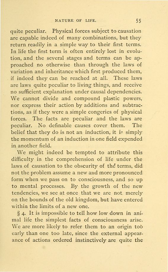 quite peculiar. Physical forces subject to causation are capable indeed of many combinations, but they return readily in a simple way to their first terms. In life the first term is often entirely lost in evolution, and the several stages and terms can be approached no otherwise than through the laws of variation and inheritance which first produced them, if indeed they can be reached at all. These laws are laws quite peculiar to living things, and receive no sufficient explanation under causal dependencies. We cannot divide and compound plastic powers, nor express their action by additions and subtractions, as if they were a simple congeries of physical forces. The facts are peculiar and the laws are peculiar. No definable causes cover them. The belief that they do is not an induction, it simply the momentum of an induction in one field expended in another field.