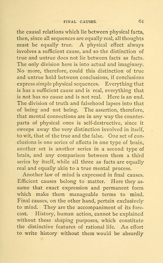 Another law of mind is expressed in final causes. Efficient causes belong to matter. Here they assume that exact expression and permanent form which make them manageable terms to mind. Final causes, on the other hand, pertain exclusively to mind. They are the accompaniment of its forecast. History, human action, cannot be explained without these shaping purposes, which constitute the distinctive features of rational life. An effort to write history without them would be absurdly