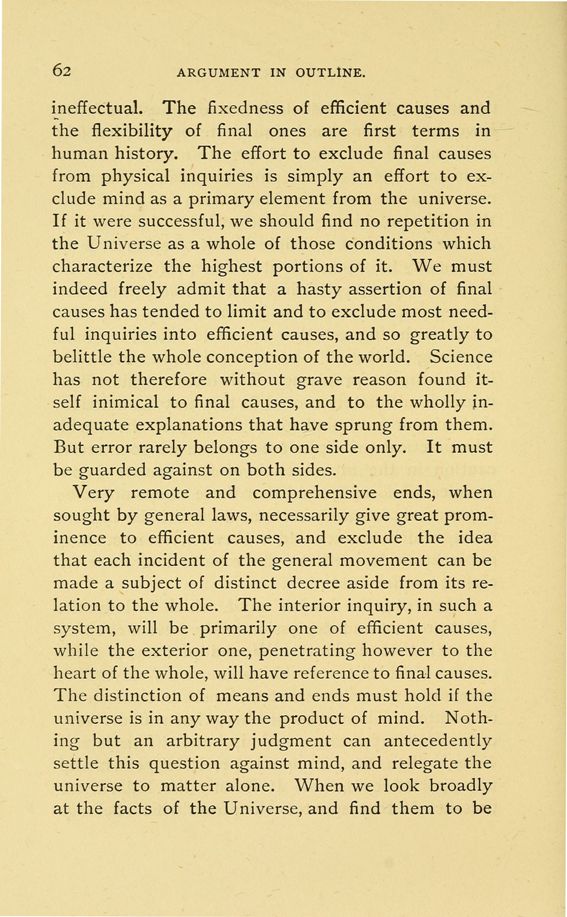 ineffectual. The fixedness of efficient causes and the flexibility of final ones are first terms in human history. The effort to exclude final causes from physical inquiries is simply an effort to exclude mind as a primary element from the universe. If it were successful, we should find no repetition in the Universe as a whole of those conditions which characterize the highest portions of it. We must indeed freely admit that a hasty assertion of final causes has tended to limit and to exclude most needful inquiries into efficient causes, and so greatly to belittle the whole conception of the world. Science has not therefore without grave reason found itself inimical to final causes, and to the wholly inadequate explanations that have sprung from them. But error rarely belongs to one side only. It must be guarded against on both sides.