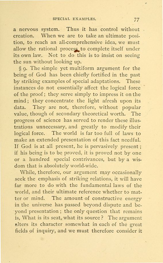 §9. The simple yet multiform argument for the being of God has been chiefly fortified in the past by striking examples of special adaptations. These instances do not essentially affect the logical force of the proof; they serve simply to impress it on the mind; they concentrate the light afresh upon its data. They are not, therefore, without popular value, though of secondary theoretical worth. The progress of science has served to render these illustrations unnecessary, and greatly to modify their logical force. The world is far too full of laws to make an extended presentation of this fact needful. If God is at all present, he is pervasively present; if his being is to be proved, it is proved not by one or a hundred special contrivances, but by a wisdom that is absolutely world-wide.