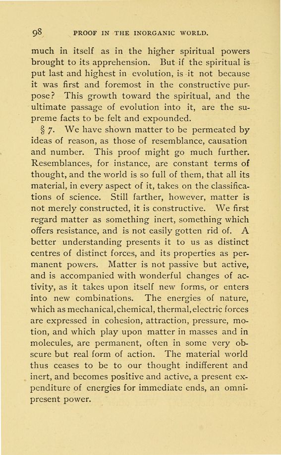 § 7. We have shown matter to be permeated by ideas of reason, as those of resemblance, causation and number. This proof might go much further. Resemblances, for instance, are constant terms of thought, and the world is so full of them, that all its material, in every aspect of it, takes on the classifications of science. Still farther, however, matter is not merely constructed, it is constructive. We first regard matter as something inert, something which offers resistance, and is not easily gotten rid of. A better understanding presents it to us as distinct centres of distinct forces, and its properties as permanent powers. Matter is not passive but active, and is accompanied with wonderful changes of activity, as it takes upon itself new forms, or enters into new combinations. The energies of nature, which as mechanical, chemical, thermal, electric forces are expressed in cohesion, attraction, pressure, motion, and which play upon matter in masses and in molecules, are permanent, often in some very obscure but real form of action. The material world thus ceases to be to our thought indifferent and inert, and becomes positive and active, a present expenditure of energies for immediate ends, an omnipresent power.
