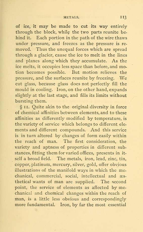 of ice, it may be made to cut its way entirely through the block, while the two parts reunite behind it. Each portion in the path of the wire thaws under pressure, and freezes as the pressure is removed. Thus the unequal forces which are spread through a glacier, cause the ice to melt in the lines and planes along which they accumulate. As the ice melts, it occupies less space than before, and motion becomes possible. But motion relieves the pressure, and the surfaces reunite by freezing. We cut glass, because glass does not perfectly fill the mould in cooling. Iron, on the other hand, expands slightly at the last stage, and fills its limits without bursting them.