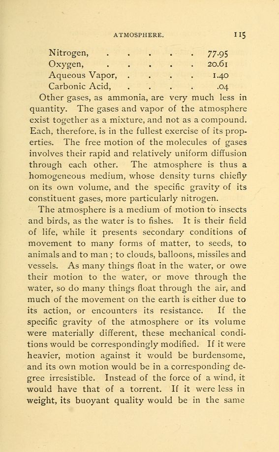 The atmosphere is a medium of motion to insects and birds, as the water is to fishes. It is their field of life, while it presents secondary conditions of movement to many forms of matter, to seeds, to animals and to man; to clouds, balloons, missiles and vessels. As many things float in the water, or owe their motion to the water, or move through the water, so do many things float through the air, and much of the movement on the earth is either due to its action, or encounters its resistance. If the specific gravity of the atmosphere or its volume were materially different, these mechanical conditions would be correspondingly modified. If it were heavier, motion against it would be burdensome, and its own motion would be in a corresponding degree irresistible. Instead of the force of a wind, it would have that of a torrent. If it were less in weight, its buoyant quality would be in the same
