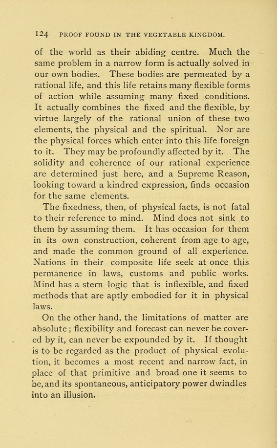 The fixedness, then, of physical facts, is not fatal to their reference to mind. Mind does not sink to them by assuming them. It has occasion for them in its own construction, coherent from age to age, and made the common ground of all experience. Nations in their composite life seek at once this permanence in laws, customs and public works. Mind has a stern logic that is inflexible, and fixed methods that are aptly embodied for it in physical laws.