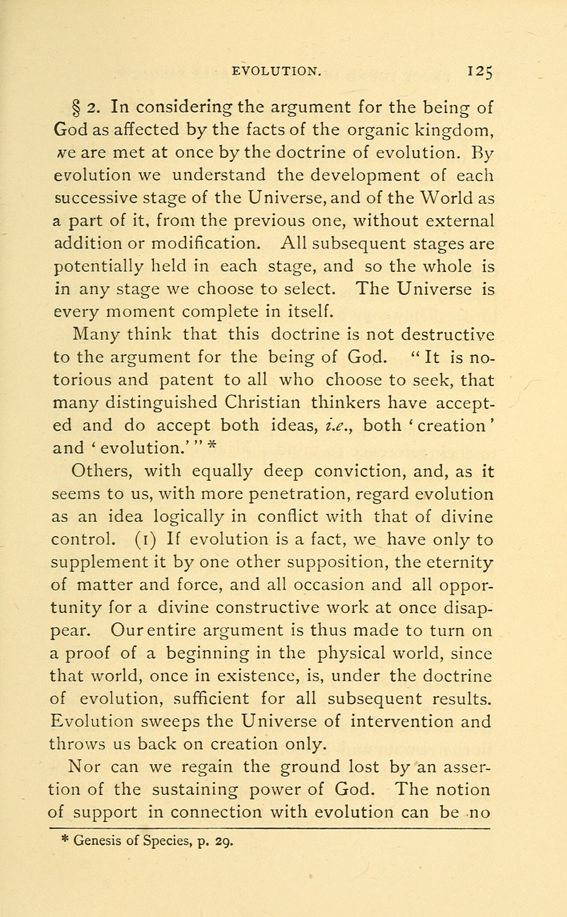 § 2. In considering the argument for the being of God as affected by the facts of the organic kingdom, we are met at once by the doctrine of evolution. By evolution we understand the development of each successive stage of the Universe, and of the World as a part of it, from the previous one, without external addition or modification. All subsequent stages are potentially held in each stage, and so the whole is in any stage we choose to select. The Universe is every moment complete in itself.