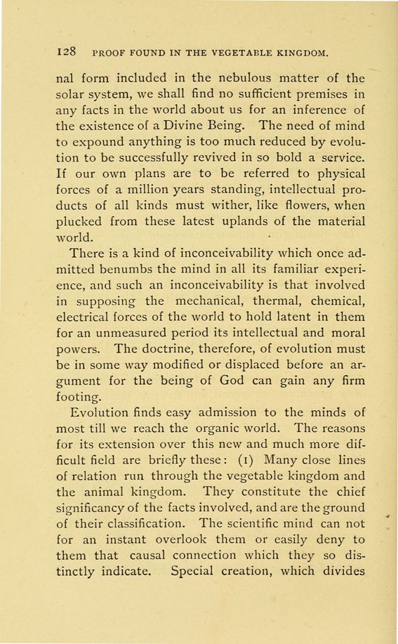 There is a kind of inconceivability which once admitted benumbs the mind in all its familiar experience, and such an inconceivability is that involved in supposing the mechanical, thermal, chemical, electrical forces of the world to hold latent in them for an unmeasured period its intellectual and moral powers. The doctrine, therefore, of evolution must be in some way modified or displaced before an argument for the being of God can gain any firm footing.