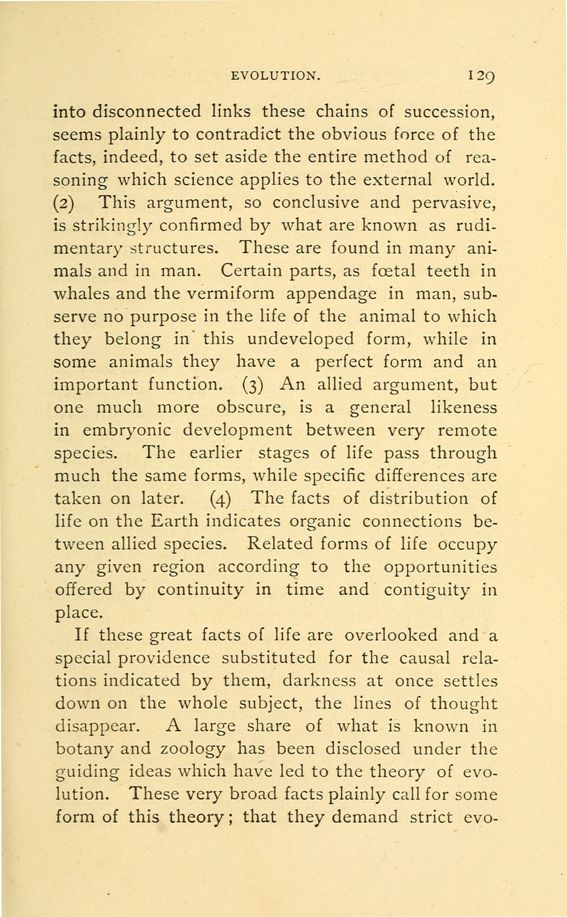 into disconnected links these chains of succession, seems plainly to contradict the obvious force of the facts, indeed, to set aside the entire method of reasoning which science applies to the external world. (2) This argument, so conclusive and pervasive, is strikingly confirmed by what are known as rudimentary structures. These are found in many animals and in man. Certain parts, as foetal teeth in whales and the vermiform appendage in man, sub-serve no purpose in the life of the animal to which they belong in this undeveloped form, while in some animals they have a perfect form and an important function. (3) An allied argument, but one much more obscure, is a general likeness in embryonic development between very remote species. The earlier stages of life pass through much the same forms, while specific differences are taken on later. (4) The facts of distribution of life on the Earth indicates organic connections between allied species. Related forms of life occupy any given region according to the opportunities offered by continuity in time and contiguity in place.