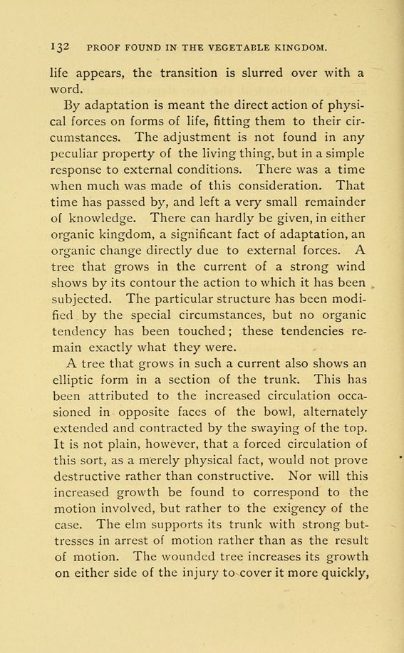 By adaptation is meant the direct action of physical forces on forms of life, fitting them to their circumstances. The adjustment is not found in any peculiar property of the living thing, but in a simple response to external conditions. There was a time when much was made of this consideration. That time has passed by, and left a very small remainder of knowledge. There can hardly be given, in either organic kingdom, a significant fact of adaptation, an organic change directly due to external forces. A tree that grows in the current of a strong wind shows by its contour the action to which it has been subjected. The particular structure has been modified by the special circumstances, but no organic tendency has been touched; these tendencies remain exactly what they were.
