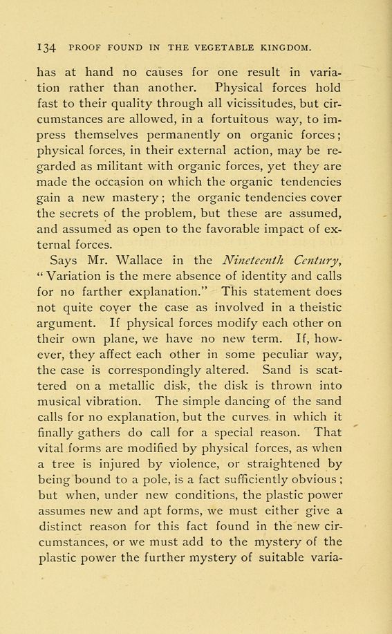 Says Mr. Wallace in the Nineteenth Century, "Variation is the mere absence of identity and calls for no farther explanation." This statement does not quite coyer the case as involved in a theistic argument. If physical forces modify each other on their own plane, we have no new term. If, however, they affect each other in some peculiar way, the case is correspondingly altered. Sand is scattered on a metallic disk, the disk is thrown into musical vibration. The simple dancing of the sand calls for no explanation, but the curves. in which it finally gathers do call for a special reason. That vital forms are modified by physical forces, as when a tree is injured by violence, or straightened by being bound to a pole, is a fact sufficiently obvious; but when, under new conditions, the plastic power assumes new and apt forms, we must either give a distinct reason for this fact found in the new circumstances, or we must add to the mystery of the plastic power the further mystery of suitable variation.